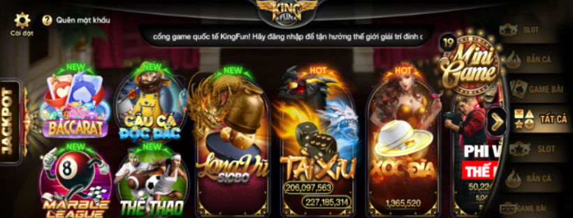 kingfun là sân chơi bài đổi thưởng uy tín nhất mang đến các trò chơi đổi tiền thật như Tài Xỉu, Bắn cá, Bắt cầu Tài xỉu, Quay hũ, Soi cầu Tài xỉu, Kéo Tài xỉu...